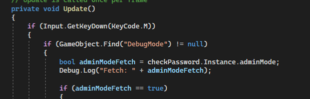 This week was time to focus purely on bugs in the game that were found through playtesting done by myself and others in my team. One of the biggest bugs were found in my admin menu when built that after typing in the password and playing the game, I would often crash. To fix this I simply checked the variable to see if its nul or not, if it is, then the code will not run saving a crash from occurring. I did have issues with this check running, because the first time I tried it, I attempted to check if the ‘adminModeFetch’ variable was valid rather than the game object itself which solved the issue.#